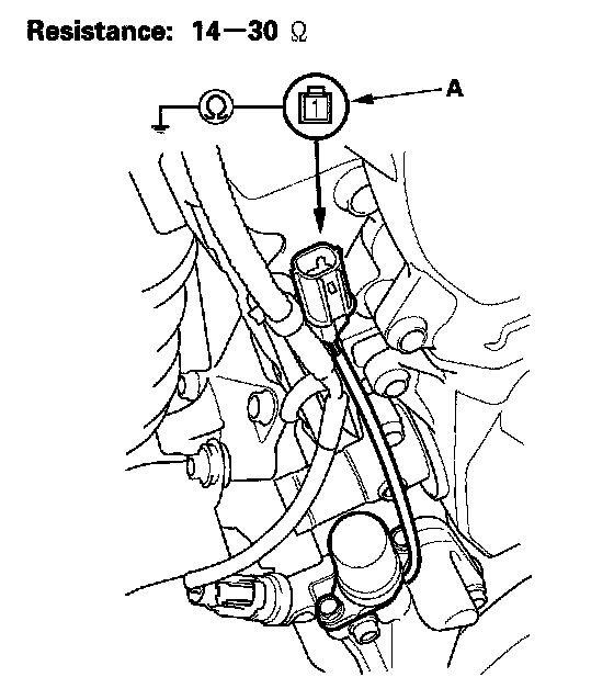 2. Measure resistance between the rocker arm oil control solenoid (VTEC solenoid valve) 1P connector terminal (A) and body ground.