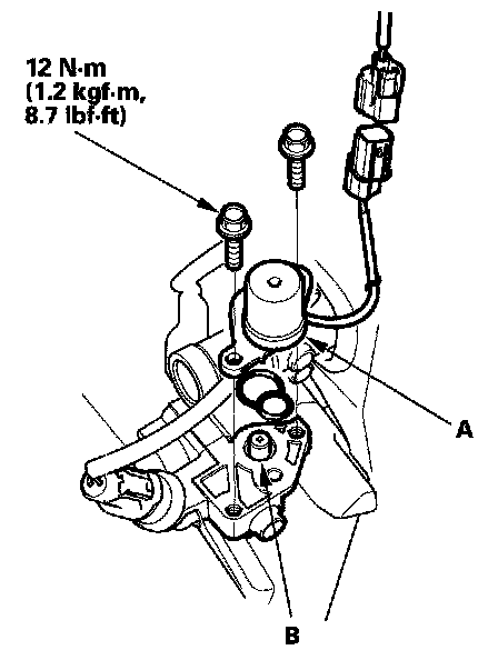 4. If the filter is not restricted, remove the rocker arm oil control solenoid (VTEC solenoid valve) (A) and push the valve (B) with your finger to check its movement. If the valve moves freely, it is normal, check the engine oil pressure.If the valve binds or sticks, replace the rocker arm oil control solenoid (VTEC solenoid valve) assembly.