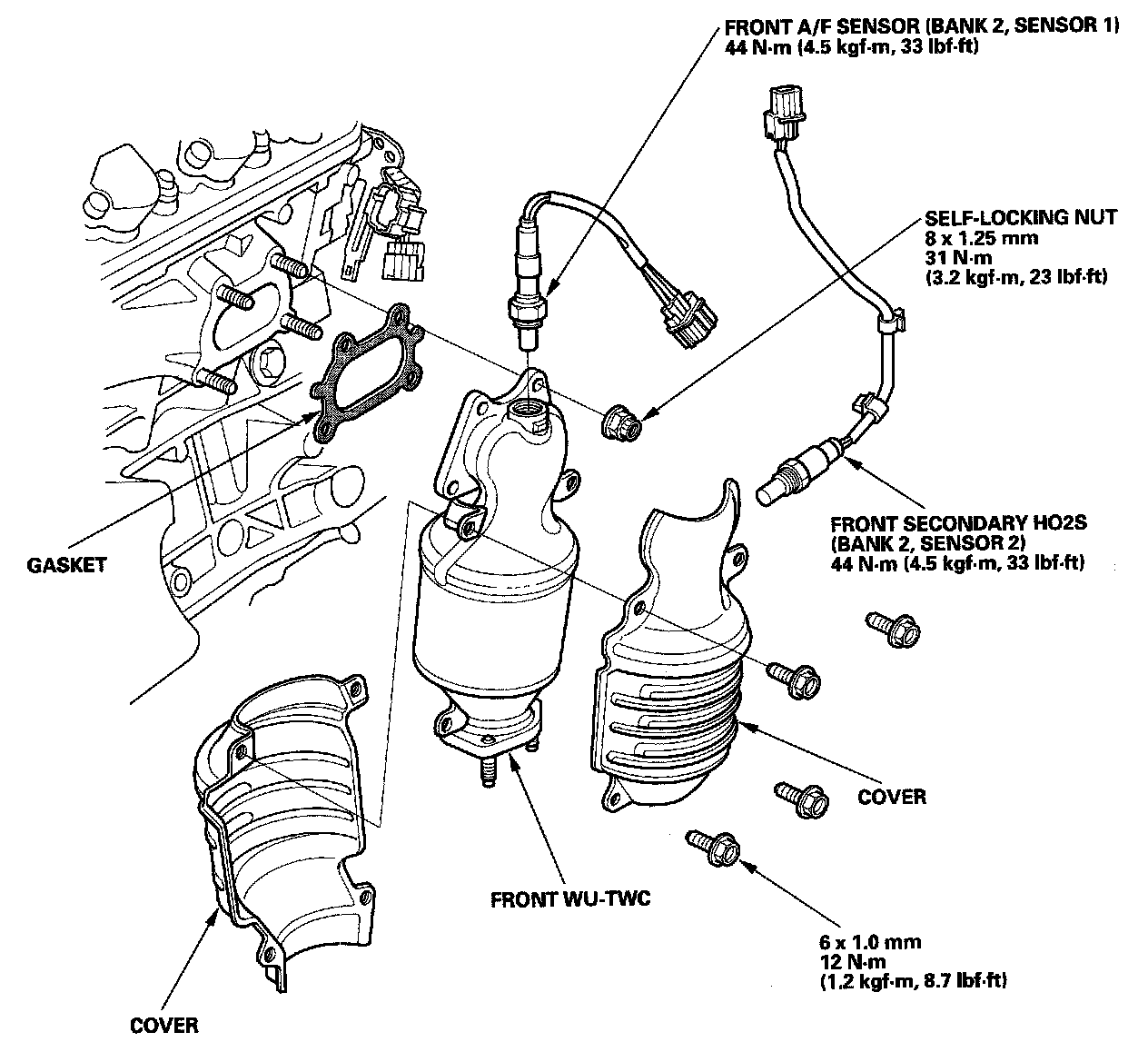 2. Disconnect the front air fuel ratio (A/F) sensor connector and front secondary heated oxygen sensor (secondary HO2S) connector.