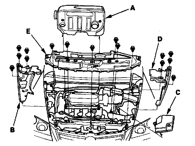 Ignition Coil Removal/Installation1. Remove the intake manifold cover (A) right upper fender trim (B), battery trim (C), left upper fender trim (D), then remove the grille cover (E).