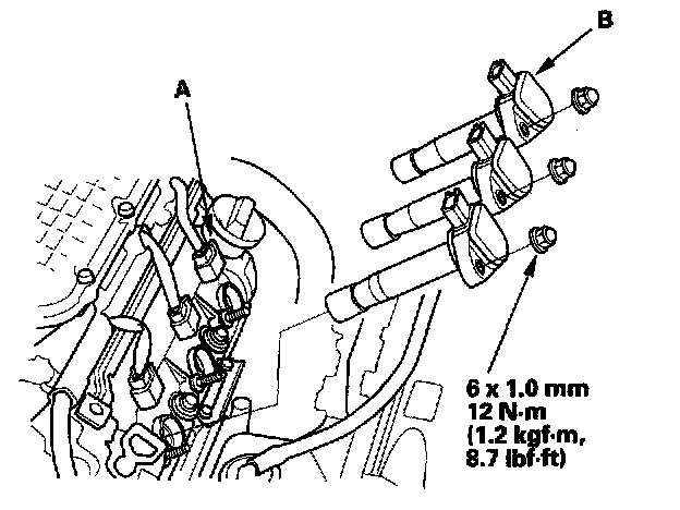 2. Disconnect the ignition coil connectors (A), then remove the front bank ignition coils (B).