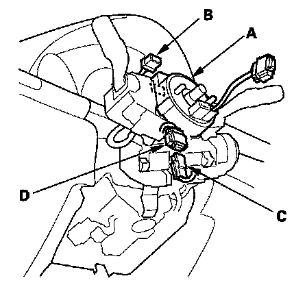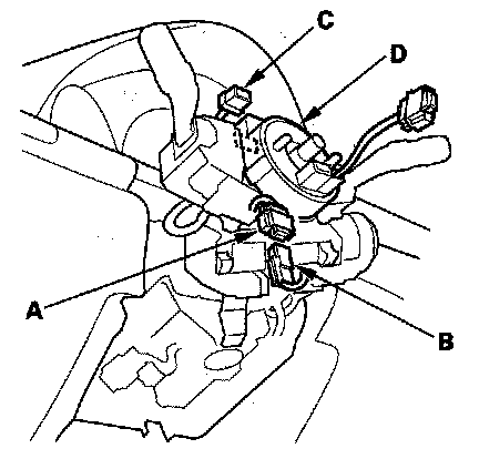 8. Disconnect the dashboard wire harness A 4P connector (A) from the cable reel 4P connector (B), then disconnect the dashboard wire harness B ('05 model) or the dashboard wire harness A ('06-07 models) 20P connector (C) from the cable reel (D).