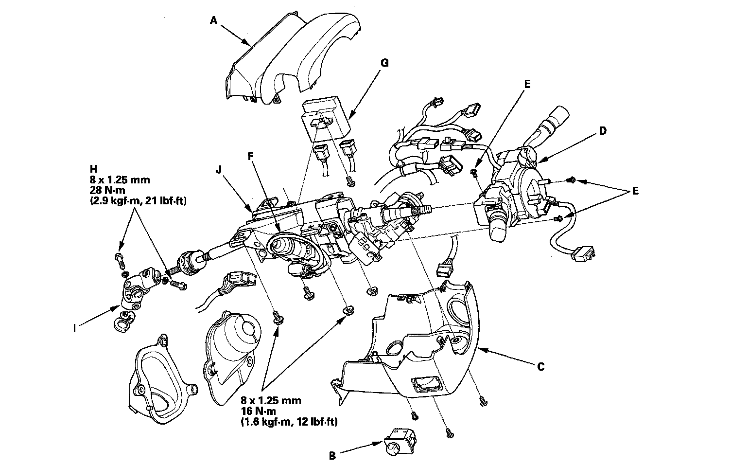 13. Remove the steering column (J) by removing the attaching nuts and bolts.