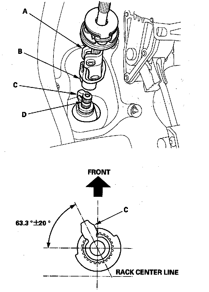 4. With the rack in the straight ahead driving position, slip the lower end of the steering joint on to the pinion shaft (D).