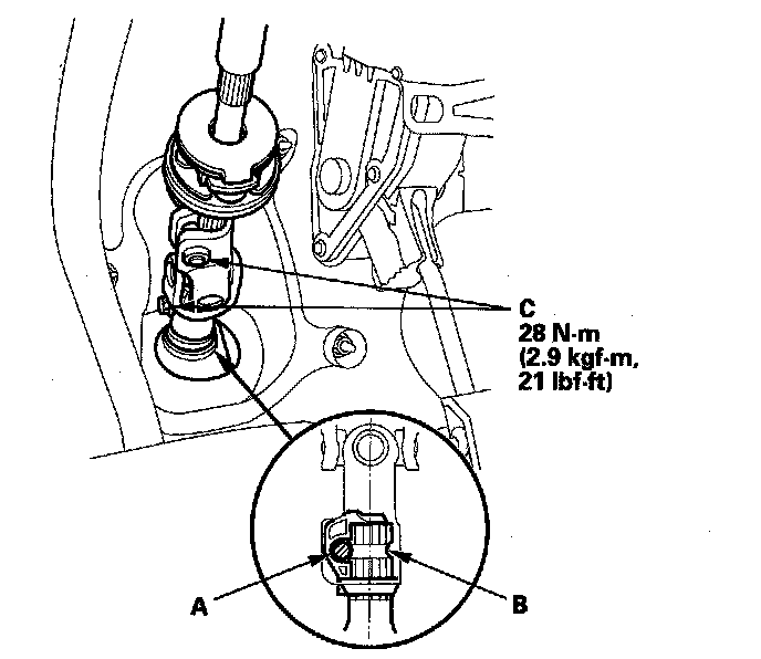5. Align the bolt hole (A) on the steering joint with the groove (B) around the pinion shaft, and loosely install the joint bolts (C). Be sure that the joint bolt is securely in the groove in the pinion shaft. Pull on the steering joint to make sure that the steering joint is fully seated. Tighten the steering joint bolt to the specified torque.