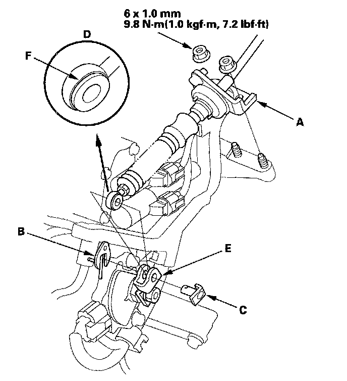 12. Remove the spring clip/washer (B) and control pin (C), then separate the shift cable end (D) from the control lever (E). Check synthetic resin bushing (F) in the shift cable end for a proper fit and wear. If the bushing is fitted loose or worn, replace the shift cable.