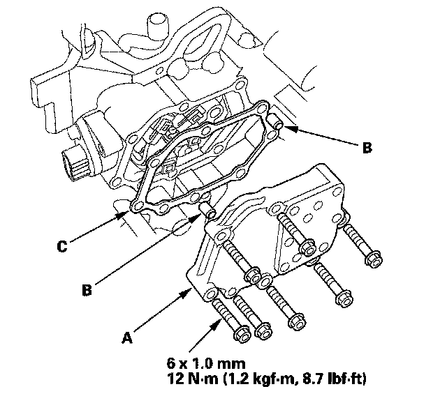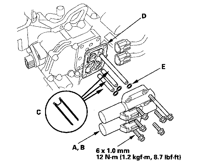NOTE: Do not install shift solenoid valve C before installing shift solenoid valve A. If shift solenoid valve C is installed before installing shift solenoid valve A, it may damage the hydraulic control system.