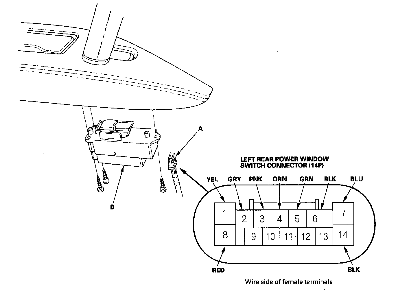 3. Disconnect the 14P connector (A) from the left rear power window switch (B).