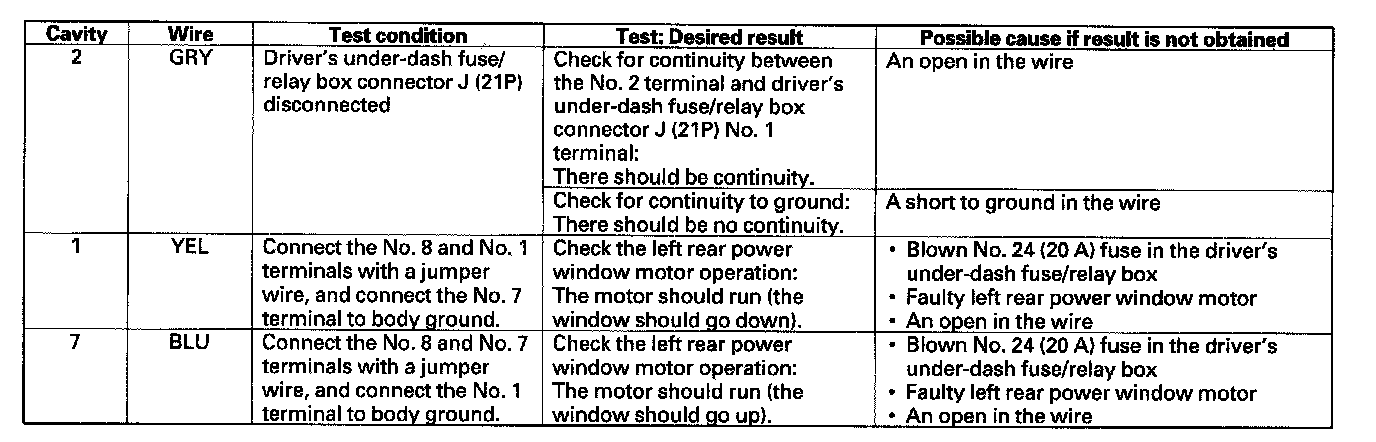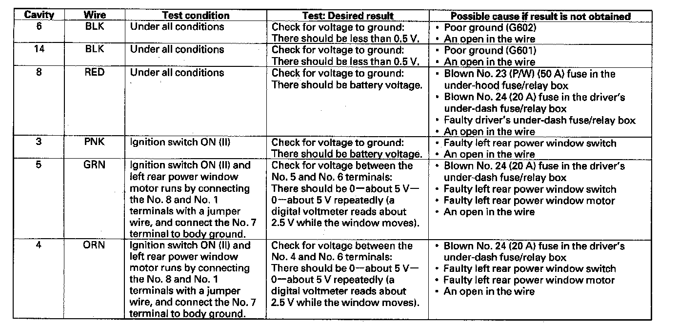 6. Reconnect the connector to the left rear power window switch, and make these input tests at the connector.