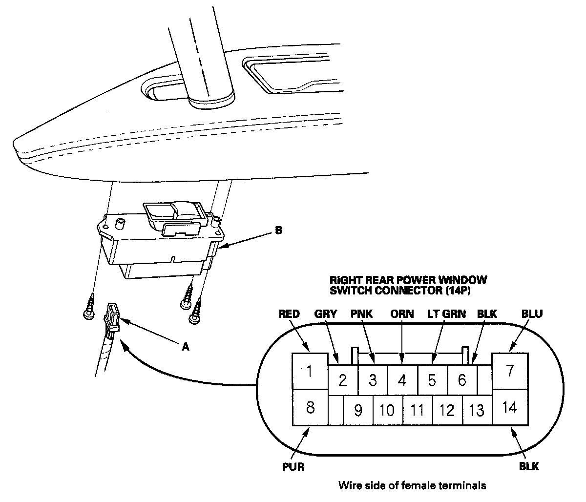3. Disconnect the 14P connector (A) from the right rear power window switch (B).