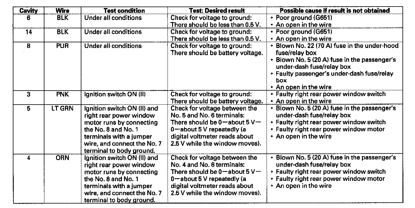 6. Reconnect the connector to the right rear power window switch, and make these input tests at the connector.