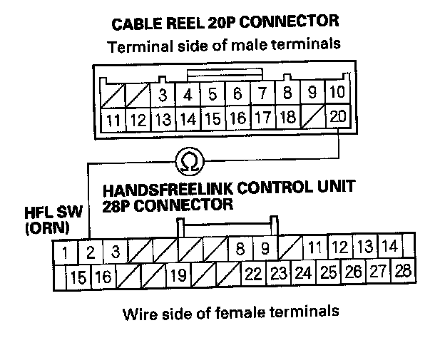 5. Check for continuity between cable reel 20P connector terminal No. 19 and HandsFreeLink control unit 28P connector terminal No. 2.