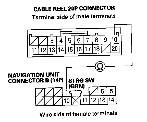 6. Check for continuity between cable reel 20P connector terminal No. 1 and navigation unit connector B (14P) terminal No.10.