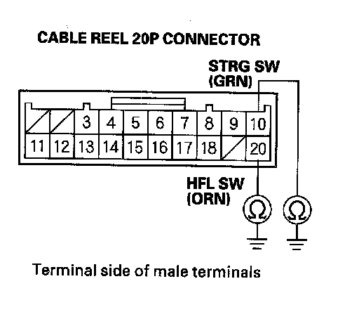 7. Check for continuity between body ground and cable reel 20P connector terminals No. 10 and No. 19.