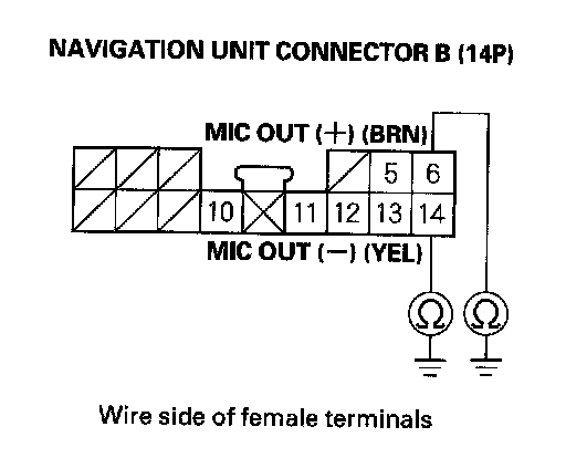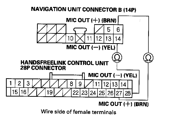 11. Check for continuity between navigation unit connector B (14P) terminal No. 6 and No. 14, and the HandsFreeLink control unit 28P connector terminal No. 27 and No. 28.