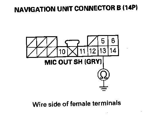 13. Check for continuity between the navigation unit connector B (14P) terminal No. 13 and body ground.