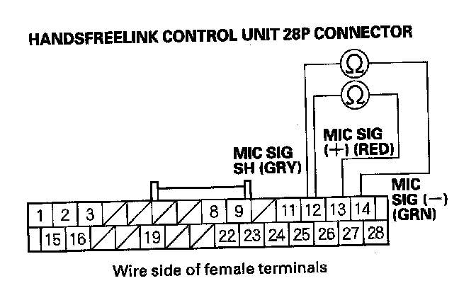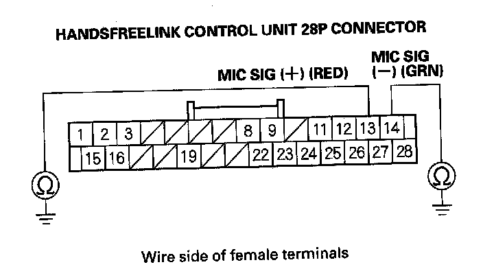 15. Check for continuity between the HandsFreeLink control unit 28P connector terminal No. 12 and terminals No. 13 and No. 14.