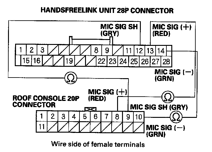 17. Check for continuity between the appropriate HandsFreeLink control unit 28P connector terminals and the roof console 20P connector terminals.
