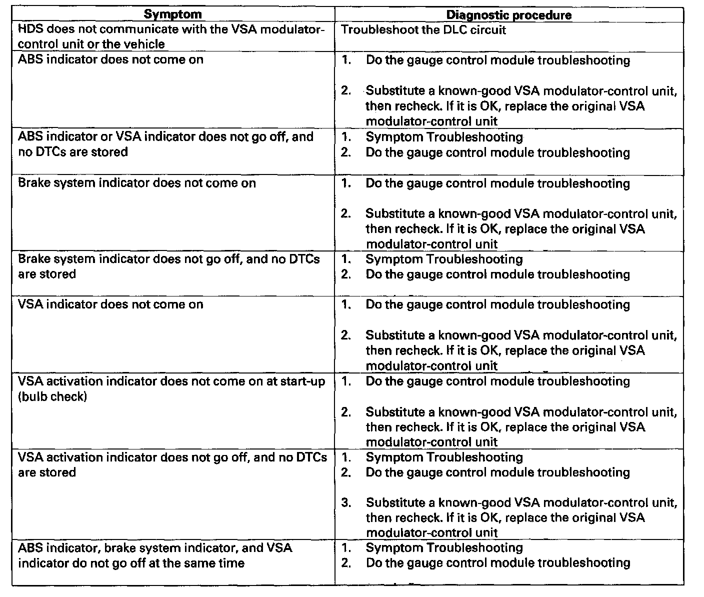 Symptom Troubleshooting IndexWhen the vehicle has one of these symptoms, check for a diagnostic trouble code (DTC) with the HDS. If there is no DTC, do the diagnostic procedure for the symptom, in the sequence listed, until you find the cause.