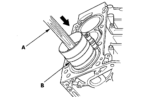 13. Position the piston/connecting rod assembly in the cylinder, and tap it in using the wooden handle of a hammer (A). Maintain downward force on the ring compressor (B) to prevent the rings from expanding before entering the cylinder bore.