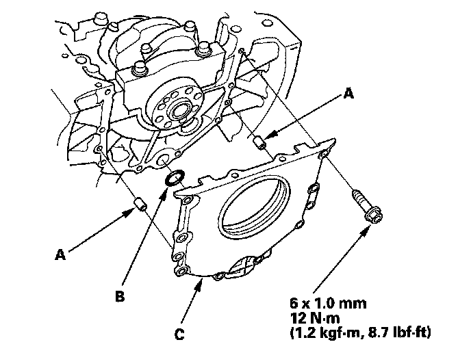 28. Install the dowel pins (A), new O-ring (B), and the engine block end cover (C) on the engine block.