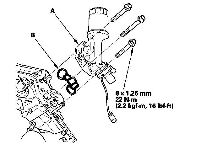 19. Apply new engine oil to the bolt threads and flanges. Torque the bolts (B) to 20 Nm (2.0 kgf-m, 14 lbf-ft).