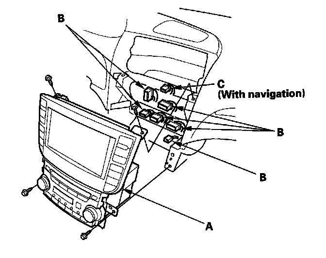 5. Disconnect the connectors (B, C), then remove the audio-HVAC display module assembly.