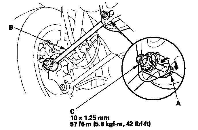 3. Hold the adjusting bolt (A) on the rear control arm (B), and loosen the self-locking nut (C).