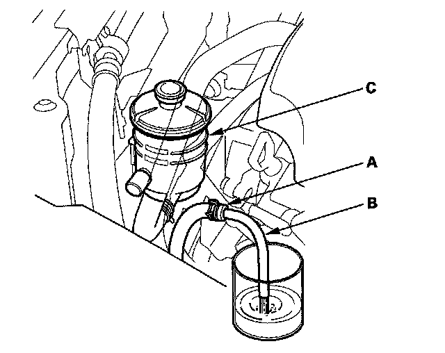 3. Start the engine, let it run at idle, and turn the steering wheel from lock-to-lock several times. When fluid stops running out of the hose, shut off the engine. Discard the fluid.