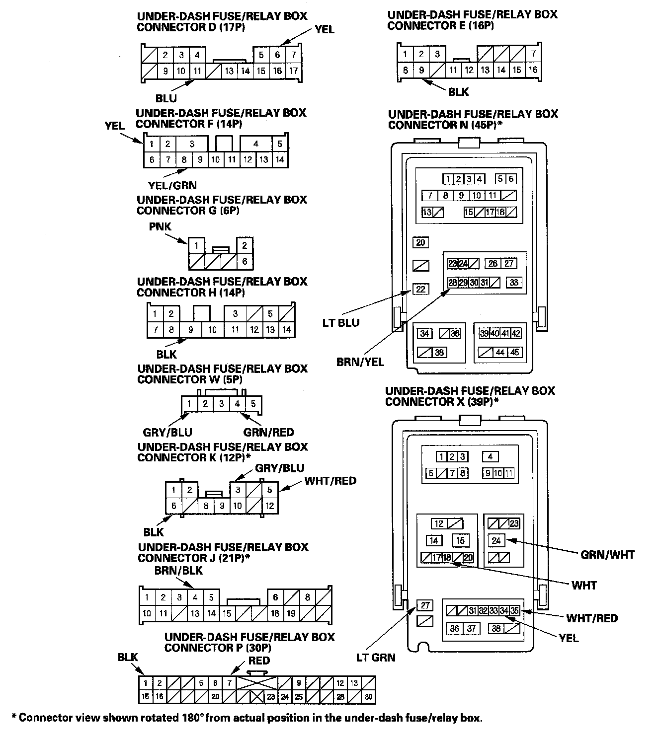 2. Disconnect the under-dash fuse/relay box connectors D, E, F, G, H, J, K, M, N, P, W and X.