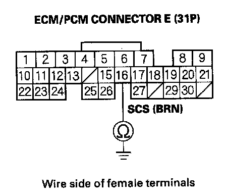 7. Check for continuity between ECM/PCM connector terminal E16 and body ground.