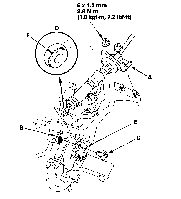 9. Check the synthetic resin bushing (F) in the shift cable end for a proper fit and wear. If the bushing is loose or worn, replace the shift cable.