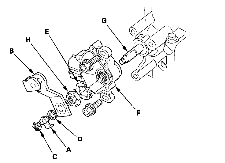 12. Pry the lock tabs of the lock washer (E) on the transmission range switch (F), hold the selector control shaft (G) with a 6.0 mm wrench, and loosen the locknut (H).