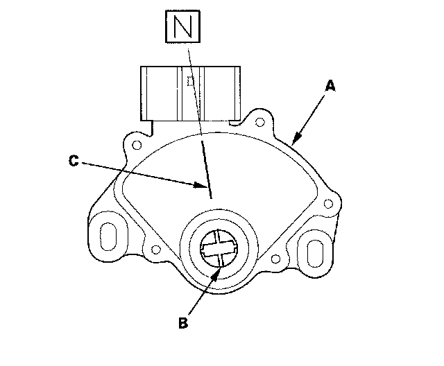 14. Set the new transmission range switch (A) to the N position. The transmission range switch clicks in the N position, and the selector control shaft hole (B) aligns with the N position line (C).