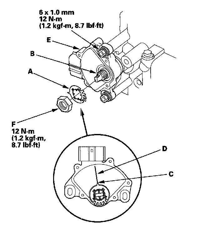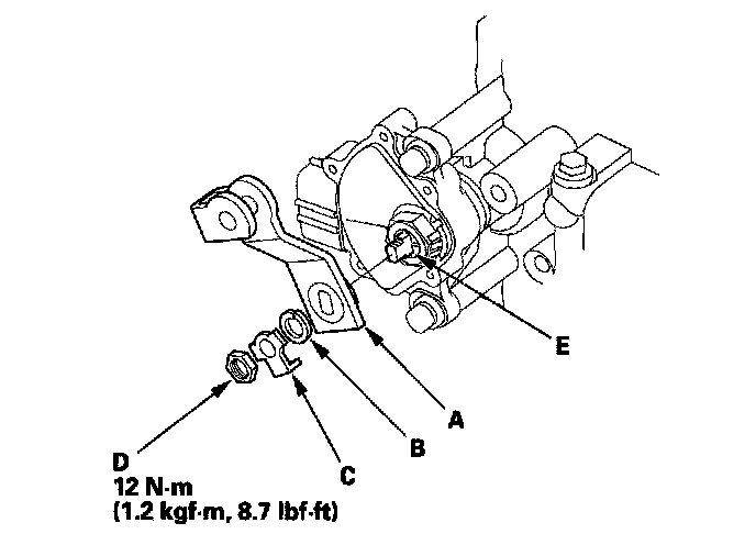 17. Install the new lock washer (A) over the selector control shaft (B) while aligning the projection (C) of the lock washer with the N positioning line (D) on the transmission range switch (E), and install the locknut (F).