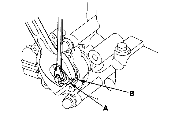 18. Push the locknut against the transmission housing to seat the transmission range switch into the selector control shaft, and tighten the locknut (A) to 12 N-m (1.2 kgf-m, 8.7 lbf-ft) while holding the selector control shaft with a 6.0 mm wrench, then bend the lock tabs (B) against the locknut.