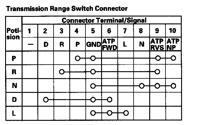 9. The transmission range switch test is finished if the test results are OK. If there is no continuity between any terminals, check that transmission range switch installation. If the switch installation is OK, replace the switch.