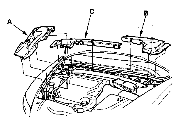 1. Remove the right side engine compartment cover (A), then remove the left rear engine compartment cover (B) and right rear engine compartment cover (C).