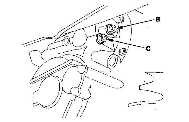 14. Shift to 1st gear, and measure the 1st clutch pressure at the 1st clutch pressure inspection port (B) and the 1st-hold clutch pressure at the 1st-hold clutch pressure inspection port (C) while holding the engine speed at 2,000 rpm.