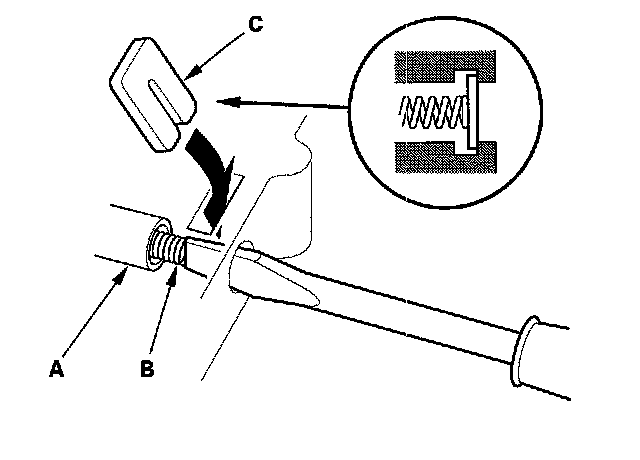 3. Install the valve (A) and valve spring (B) in the valve body. Push the valve spring in with a screwdriver, then install the spring seat (C).