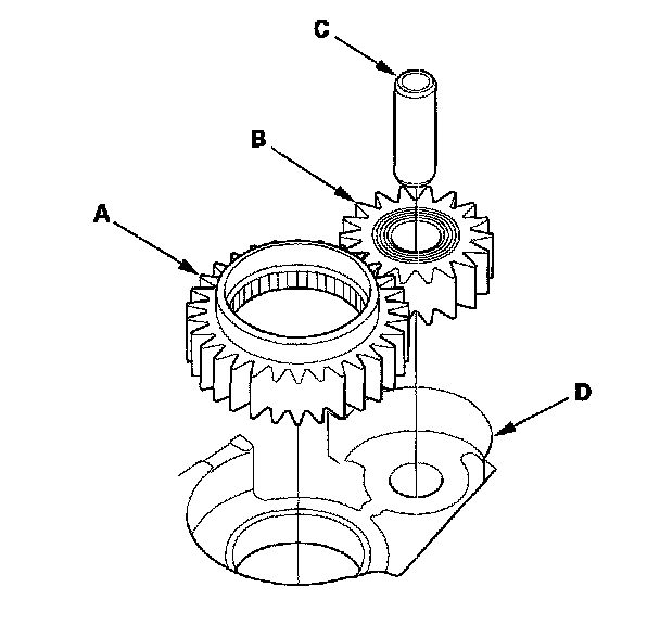 1. Install the ATF pump drive gear (A), driven gear (B), and ATF pump driven gear shaft (C) in the main valve body (D). Lubricate all parts with ATF, and install the ATF pump driven gear with its grooved and chamfered side facing up.