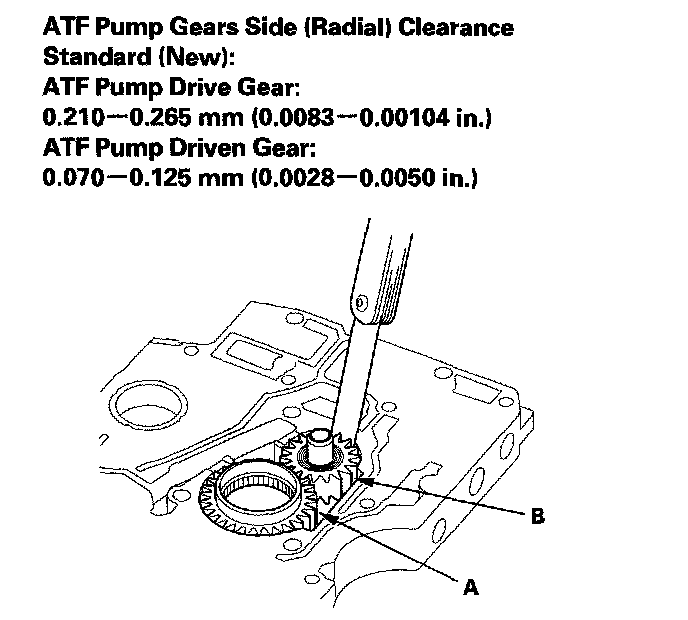 2. Measure side clearance of the ATF pump drive gear (A) and driven gear (B).
