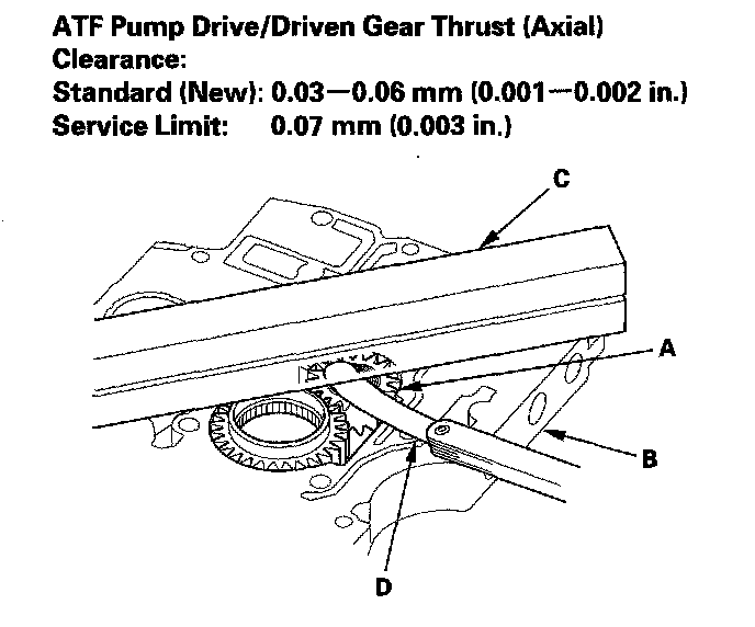 3. Remove the ATF pump driven gear shaft. Measure the thrust clearance between the ATF pump driven gear (A) and the valve body (B) with a straight edge (C) and a feeler gauge (D).