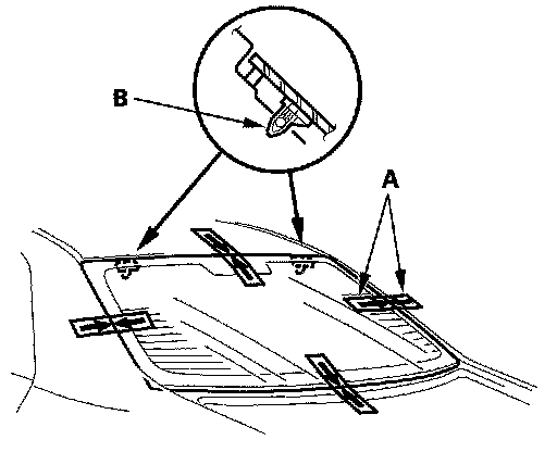 15. Set the rear window in the opening, and center it. Make alignment marks (A) across the rear window and body with a grease pencil at the four points shown. Make sure both upper clips (B) are in the body holes. Be careful not to touch the rear window where adhesive will be applied.