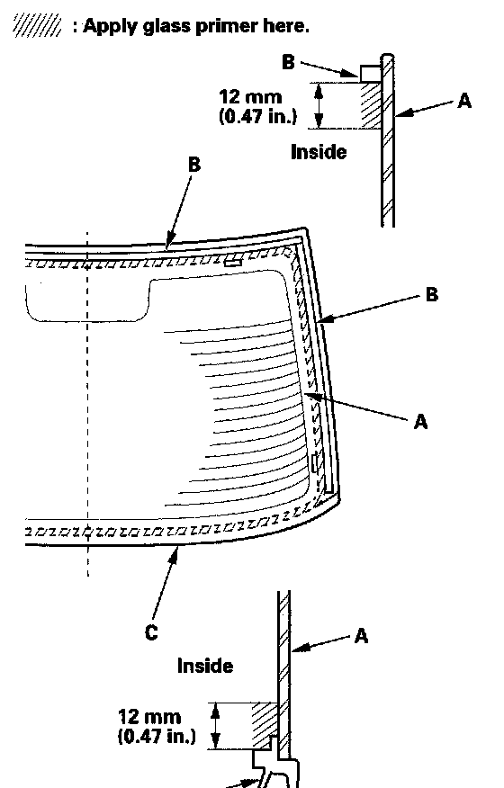 17. With a sponge, apply a light coat of glass primer along the edge of the rear window (A) between the dams (B) and molding (C) as shown, then lightly wipe it off with gauze or cheesecloth: