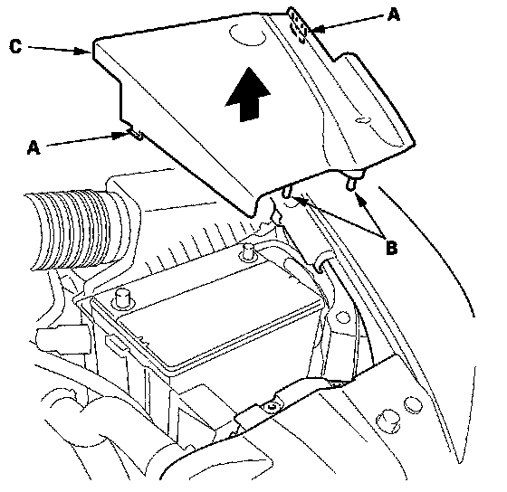 1. Remove the washer reservoir cap (A), and release the hooks (B) and pins (C), then remove the right side engine compartment cover (D).