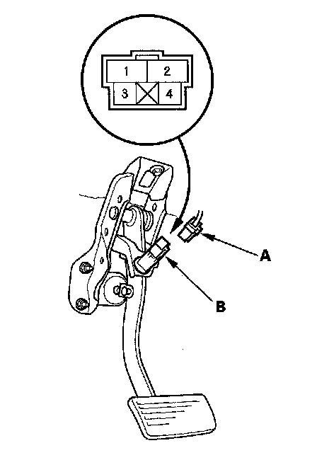 Brake Pedal Position Switch Test1. Disconnect the 4P connector (A) from the brake pedal position switch (B).