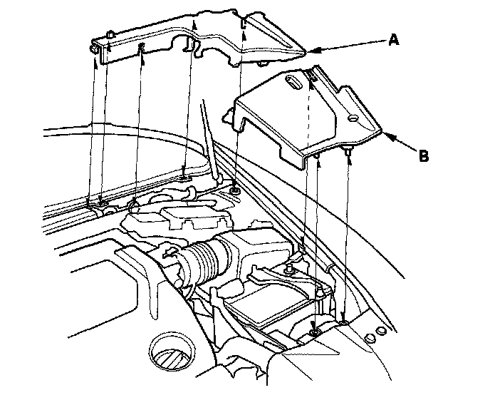 6. Remove the left rear engine compartment cover (A) and the left side engine compartment cover (B).