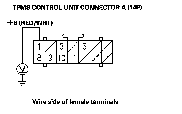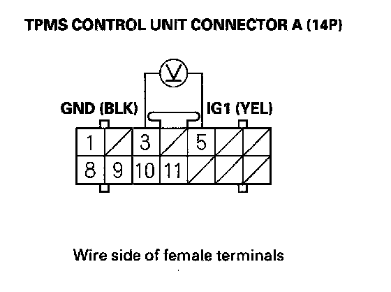 7. Measure voltage between body ground and TPMS control unit connector A (14P) terminal No. 1.
