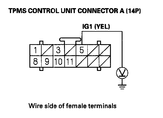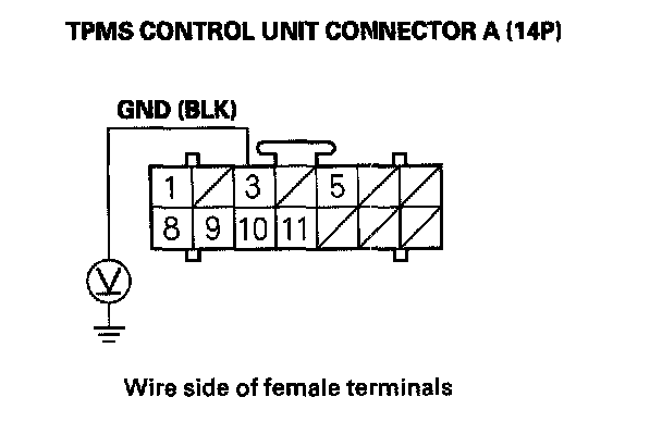 9. Measure voltage between body ground and TPMS control unit connector A (14P) terminal No. 5.